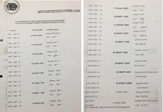 Olmadı daha ne yapalım diye düşünüp durdular bazı aldığımız hakları nasıl meslektaşlardan alırız da yabancılara teslim ederiz diye çaba sarf ettiler. Bu arada dişinizden tırnağınızdan sizlere kazandırdığımız hakları Mahmut Yetim devlete kazık atıyor diye Rekabet Kurumuna müracaat ederek, bu fiyat listelerini elimizden aldılar. Bakın her sene yukarıdaki tablolarda görüldüğü gibi cam ve çerçeve fiyatlarını dikkatle bakın artış oranlarını meslektaşlarımızın emeğinin karşılığını alabilmeleri adına mücadele ettik. Bu hain çetelerin son getirdiği duruma bakın ona göre karar verin ve son olarak oynadıkları oyunu gördünüz.