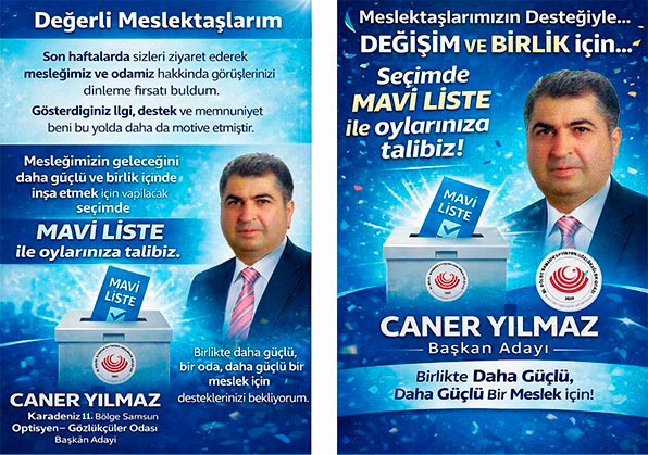 Optik sektöründe uzun yıllardır hizmet veren Caner Yılmaz, meslektaşlarının desteğiyle XI. Bölge Karadeniz Samsun Optisyen Gözlükçüler Odası Başkanlığına aday olduğunu açıkladı.