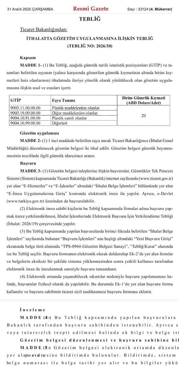 Düzenlemeye göre, belirlenen GTİP kapsamındaki ürünlerin birim gümrük kıymetinin 20 ABD dolarının altında olması durumunda, ithalat işlemleri için gözetim belgesi alınması zorunlu hale getirildi. Belge bulunmadan gümrük beyannamesi tescil edilemiyor.