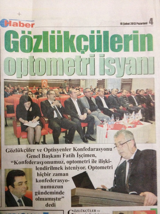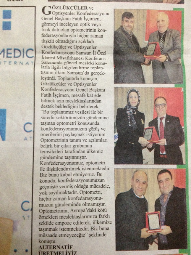 Gözlükçüler ve Optisyenler Konfederasyonu Genel başkanı Fatih İşçimen görmeyi inceleyen optik veya fizik dalı olan optometrinin konfederasyonlarıyla hiç bir zaman ilişkili olmadığını açıkladı. Gözlükçüler ve Optisyenler Konfederasyonu Samsun İl Özel İdaresi misafirhanesi konferans salonunda güncel mesleki konularla ilgili bilgilendirme toplantısının ilkini Samsun'da gerçekleştirdi. Gözlükçüler ve Optisyenler Gwnel Başkanı Fatih İşçimen mesafe katedebilmek için meslektaşlarımızdan destek beklediklerini belirterek " Bu toplantımız vesilesi ile bir süredir sektörümüzün gündemine taşınan optometri konusunda konfederasyonumuzun görüş ve önerilerini paylaşmak istiyorum.