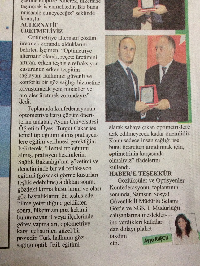 Geçtiğimiz haftasonu Samsun Gözlükçüler ve Optisyenler Derneği, Samsun İl özel idaresi misafirhanesi konferans salonunda Gözlükçüler ve Optisyenler Konfederasyonun yönetim kurulunun da katılımıyla, bilgilendirme toplantısı düzenledi, Samsunun yerel basını "Haber Gazetesi" bu toplantıya geniş yer ayırdı.