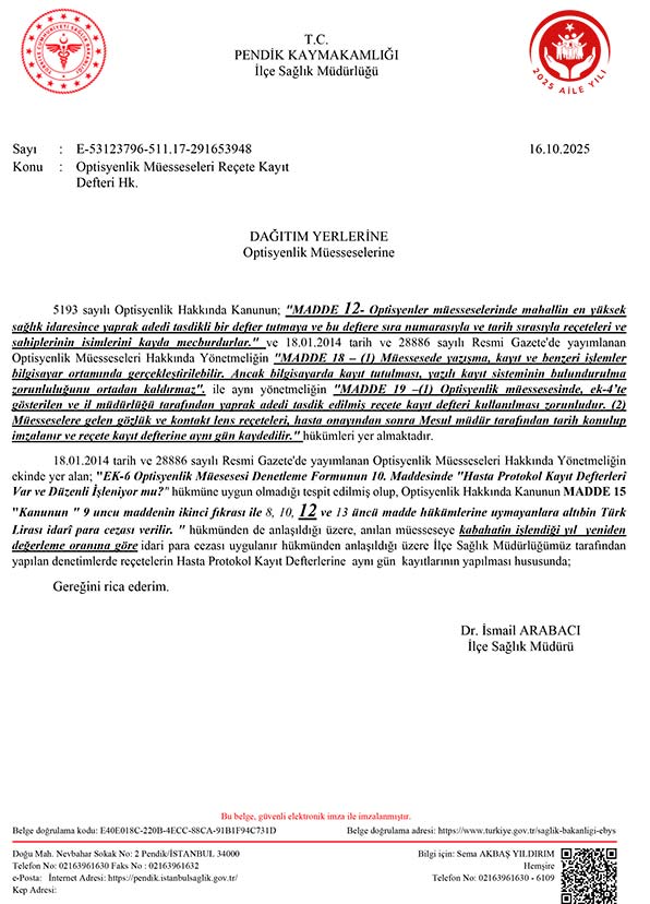 16 Ekim 2025 tarihli resmi yazıyla, Pendik İlçe Sağlık Müdürlüğü tarafından bölgedeki optisyenlik müesseselerine önemli bir uyarı gönderildi. Sağlık Bakanlığı koordinasyonuyla yürütülen bu bilgilendirme, reçete kayıt defteri uygulamasında “aynı gün kayıt” zorunluluğunu bir kez daha hatırlatıyor. İlçe denetimlerinde bazı müesseselerde kayıtların gecikmeli yapıldığı tespit edilince, konu yeniden gündeme taşındı.